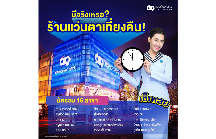 แว่นท็อปเจริญ นำโดย นายนพศักดิ์ ตรีพรชัยศักดิ์ ประธานเจ้าหน้าที่บริหาร บริษัท ร่วมเจริญพัฒนา จำกัด (มหาชน) ตอกย้ำความเป็นผู้นำบริการด้านสายตาแบบครบวงจร เปิดตัวครั้งแรก “ร้านแว่นตาเที่ยงคืน” พร้อมบริการแว่นด่วน 20 นาที เพื่อตอบสนองไลฟ์สไตล์คนยุคใหม่ที่ต้องการความคล่องตัว สะดวกรวดเร็ว และมีเวลารับบริการด้านสายตาที่มากขึ้นกว่าเดิม