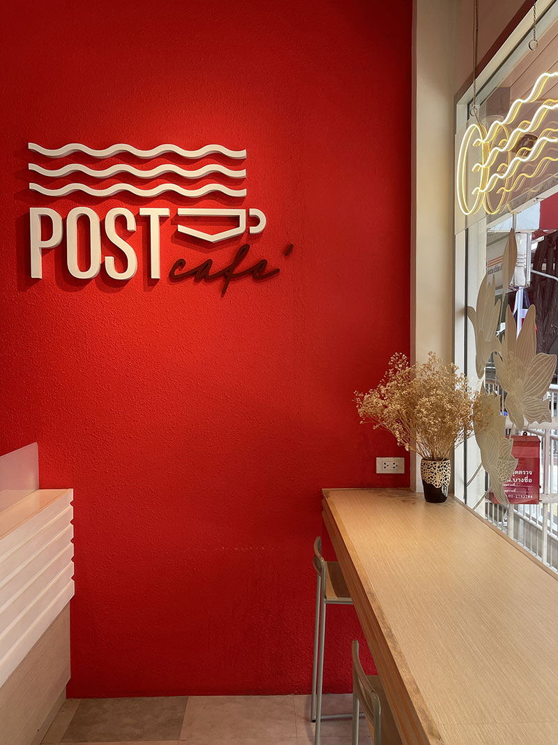 POST Café สามเสนใน ตั้งอยู่ในอาคารพาณิชย์เก่าแก่ที่ได้รับการแปลงโฉมใหม่ให้กลายเป็นคาเฟ่สไตล์โมเดิร์น-มินิมอลสุดฮิป การออกแบบตกแต่งภายในเน้นการเปิดพื้นที่ให้ผู้คนได้มาเชื่อมโยงกัน โดยยังคงอัตลักษณ์ที่โดดเด่นของไปรษณีย์ไทยไว้อย่างครบถ้วน ตั้งแต่การใช้สีแดง-ขาวเป็นสีหลักในการออกแบบ Mood & Tone ของร้าน ไปจนถึงลูกเล่นต่าง ๆ ที่ชวนให้ยิ้ม เช่น ฟันแสตมป์บนเฟอร์นิเจอร์ และเลขรหัสไปรษณีย์ไทย ๑๐๔๐๐ ที่บ่งบอกพิกัดที่ตั้งร้านได้อย่างน่ารัก ขณะที่โลโก้ร้านก็โดดเด่นไม่แพ้กัน ด้วยรูปถ้วยกาแฟคู่กับริ้วตราประทับที่สื่อถึงรอยพับของซองจดหมาย