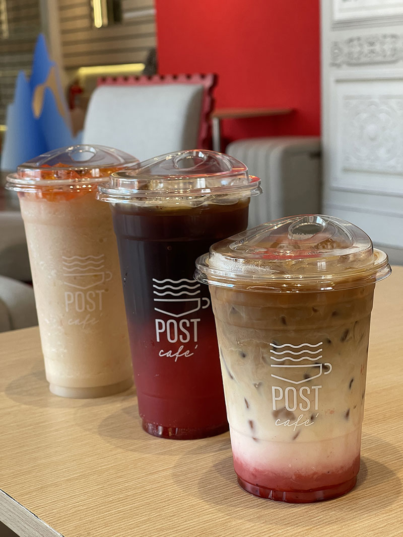 สำหรับเมนูซิกเนเจอร์ที่ต้องลองคือ “โพสต์แมน” ซึ่งเป็นอเมริกาโน่ จากเมล็ดกาแฟอาราบิก้าจากดอยปางขอน จ.เชียงราย ผสมผสานเข้ากับไซรัปสตรอว์เบอร์รีและความซาบซ่าจากโซดา ทำให้เกิดรสชาติใหม่ที่หวานอมเปรี้ยวกลมกล่อมแบบกำลังพอดีที่คอกาแฟต้องมาลิ้มลองสักครั้ง