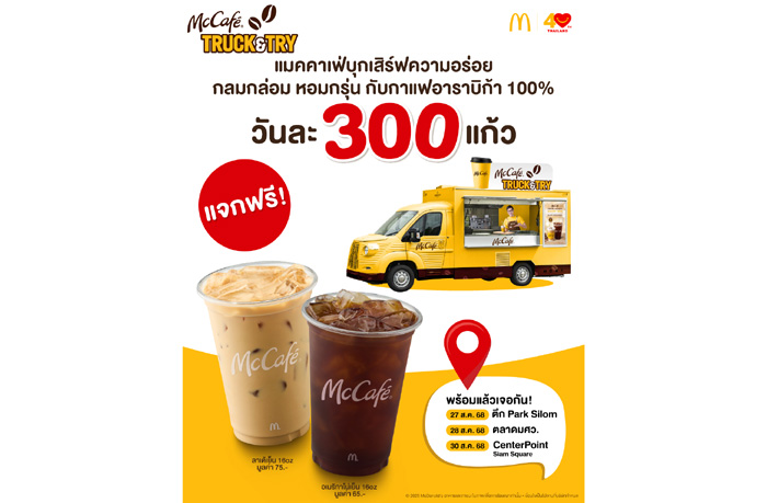 แมคคาเฟ่ บุกเสิร์ฟความอร่อยเต็มแก้วทั่วกรุง พร้อมปลุกความสดชื่นจากเมล็ดกาแฟอาราบิก้า 100% ที่ทุกคนต้องลอง! กับกิจกรรม ‘McCafe Truck & Try’ ชวนสัมผัสประสบการณ์ความอร่อยสุดกลมกล่อมและหอมกรุ่น ฟรี! เมนูอเมริกาโน่เย็น 16 ออนซ์ มูลค่า บาท หรือลาเต้เย็น 16 ออนซ์ มูลค่า 75 บาท จำนวนทั้งสิ้น 300 แก้วต่อวัน ใน 3 แห่งใจกลางเมือง ดังนี้