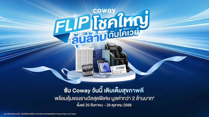 โอกาสสุดพิเศษจากโคเวย์ ประเทศไทย มอบส่วนลดค่าบริการสูงสุด 50% นานถึง 7 เดือน เมื่อสมัครใช้บริการ Subscription ผลิตภัณฑ์ Coway ทั้งเครื่องกรองน้ำ เครื่องฟอกอากาศ เก้าอี้นวด และแอร์ พร้อมลุ้นของรางวัลสุดเอ็กซ์คลูซีฟ อาทิ เก้าอี้นวดไฟฟ้า Coway รุ่น Massage Chair, Samsung Galaxy Z Fold7, Samsung Galaxy Z Flip7, Samsung Galaxy Buds3 Pro, เครื่องฟอกอากาศ Coway รุ่น Horizon และบัตรเติมน้ำมัน PTT รวมมูลค่ากว่า 2 ล้านบาท เพื่อให้ผู้บริโภคชาวไทยได้เข้าร่วมเป็นส่วนหนึ่งของครอบครัวโคเวย์ในราคาที่คุ้มค่า พร้อมยืนยันถึงความมุ่งมั่นในการให้บริการระดับพรีเมียมในประเทศไทยอย่างต่อเนื่อง และทำให้การดูแลสุขภาพตามมาตรฐานโคเวย์เป็นส่วนหนึ่งของไลฟ์สไตล์คนไทยอย่างยั่งยืน