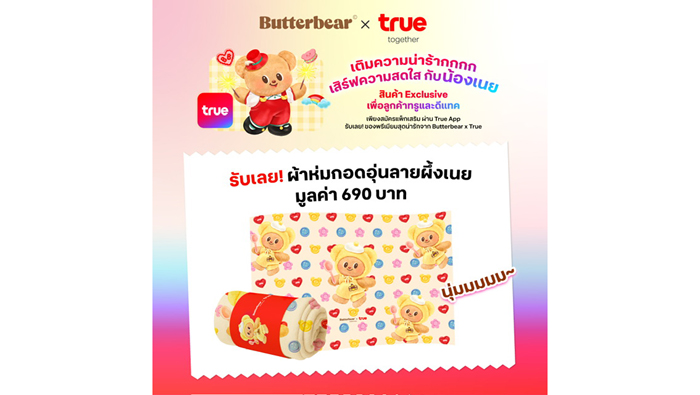 แฟนคลับน้องเนยเตรียมใจละลาย… ทรู คอร์ปอเรชั่น มอบประสบการณ์สุดพิเศษและสร้างความสุขให้กับลูกค้าคนสำคัญจับมือ Butterbear ไอดอลสาวชื่อดังแถวหน้าของไทยกับแคมเปญ Butterbear x True เติมความน่ารัก เสิร์ฟความสดใส ในสไตล์เอกลักษณ์เฉพาะตัว ส่งคอลเล็กชันของพรีเมียมน่ารักเกินต้านจากน้องเนย เพียงทำรายการตามเงื่อนไข*ผ่าน True App หรือเว็บไซต์ True Store รับเลยของพรีเมียมดีไซน์เก๋ ไอเท็มเด็ด ลิมิเต็ดอิดิชั่น ไม่ว่าจะเป็น หมวกบักเก็ต “So Sweet”, ผ้าห่ม “กอดอุ่นผึ้งเนย”, หมอน “Sundae Sweetheart”, กระเป๋า Tote Bag ลายพิเศษ รวมถึงเสื้อยืด Oversize ออกแบบเพื่อแคมเปญนี้เท่านั้น รีบตามสะสมด่วนของมีจำนวนจำกัด เอ็กซ์คลูซิฟเฉพาะช่องทางออนไลน์เท่านั้น ครอบคลุมทั้งลูกค้าปัจจุบันและลูกค้าใหม่ ไม่ว่าจะสมัครแพ็กเสริม เปิดเบอร์ใหม่ ซื้อเครื่องเปล่าและซื้อเครื่องพร้อมแพ็กเกจรายเดือน ดังนี้