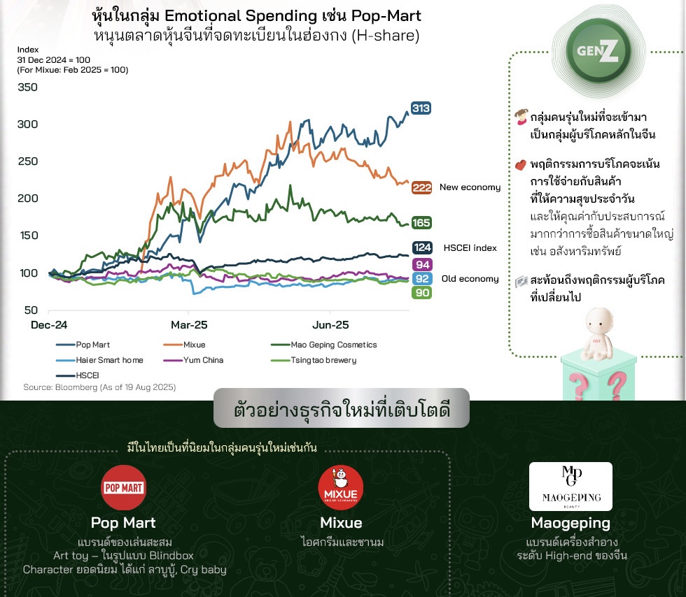 ข้อมูลจากศูนย์วิจัยกสิกรไทย รวบรวมหุ้นสินค้าที่เกี่ยวเนื่องกับเทรนด์ Emotional Spending ในจีน พบว่า มีการเติบโตของหุ้น (ดูรูปประกอบด้านล่าง)