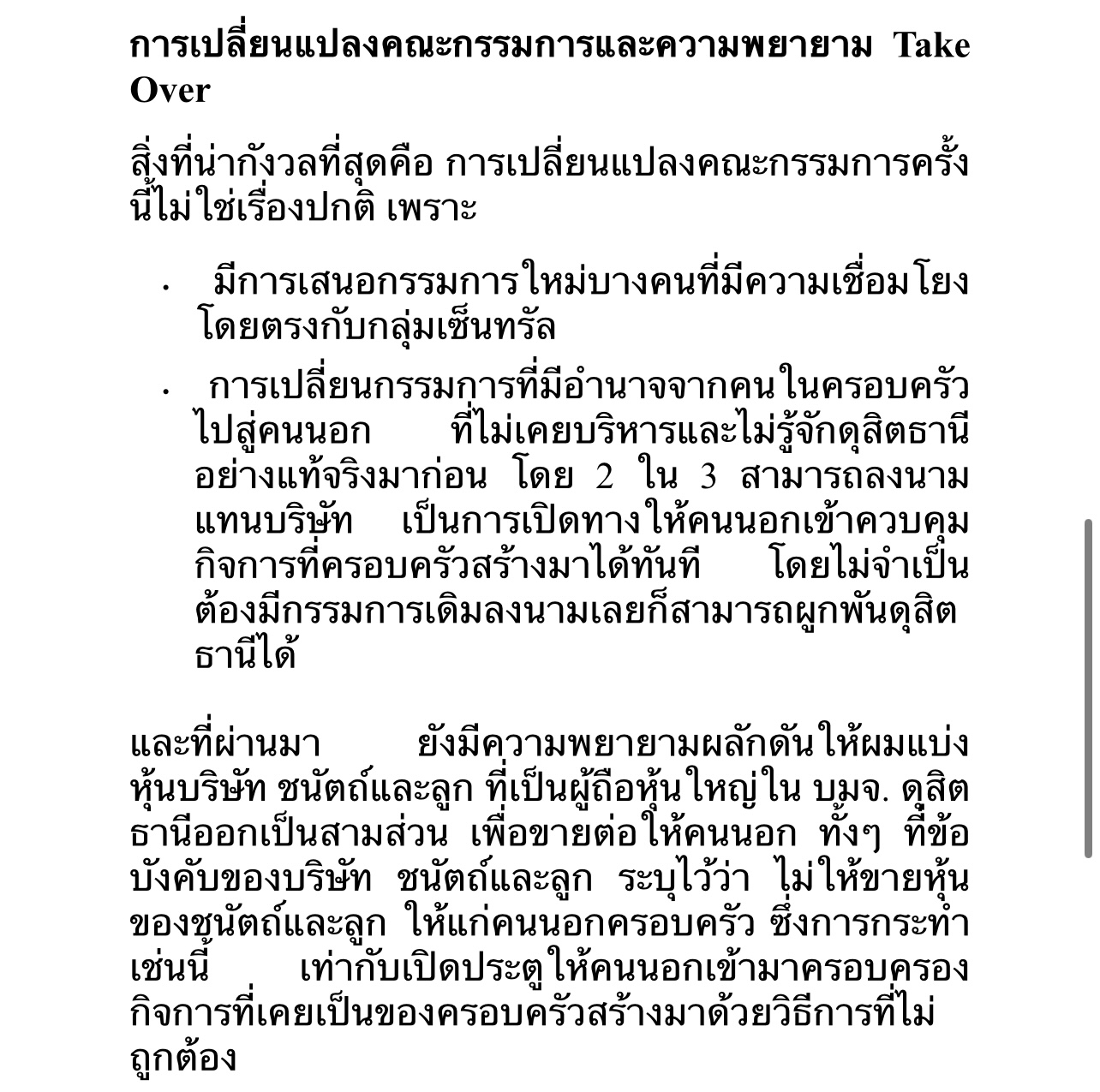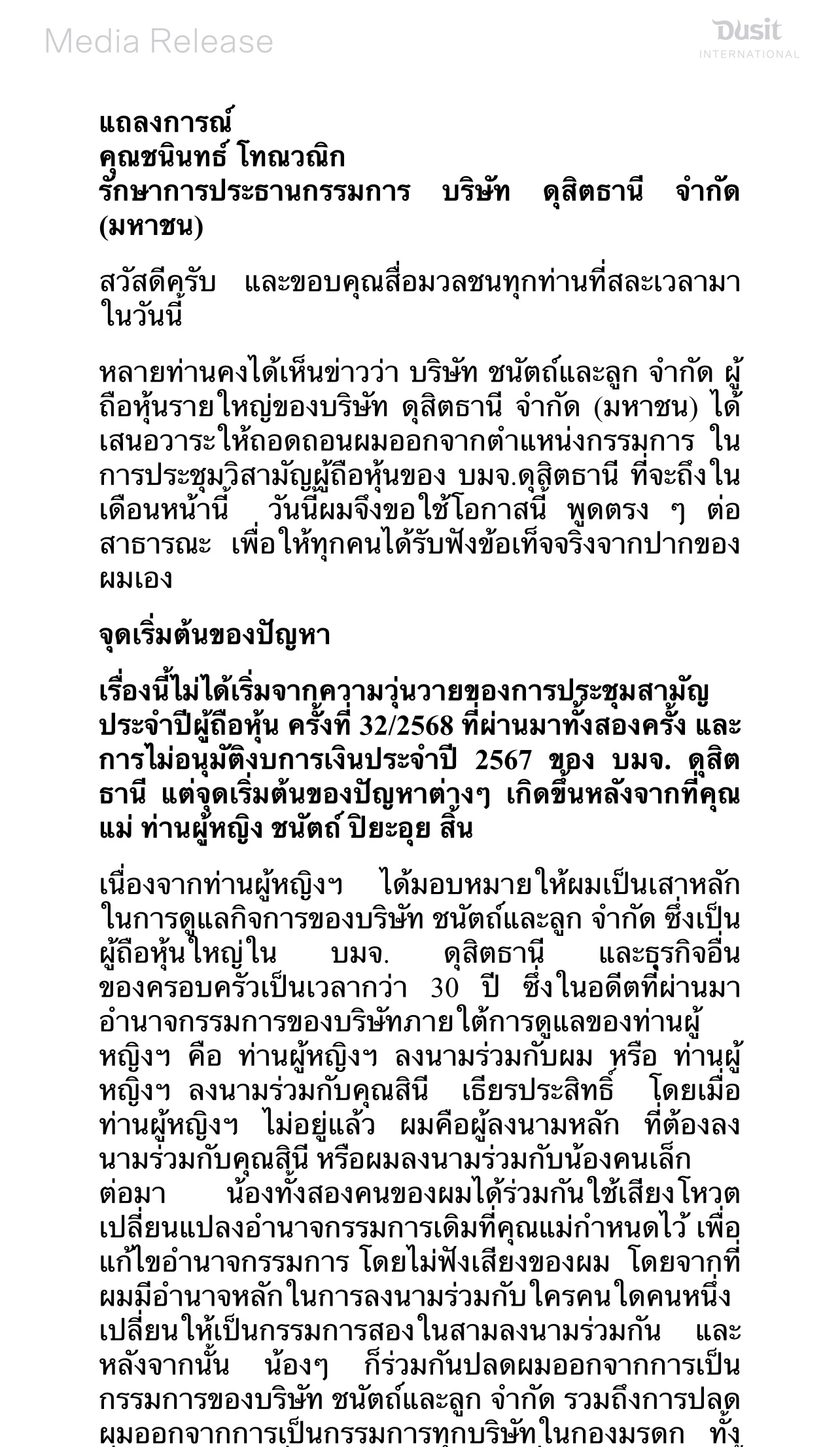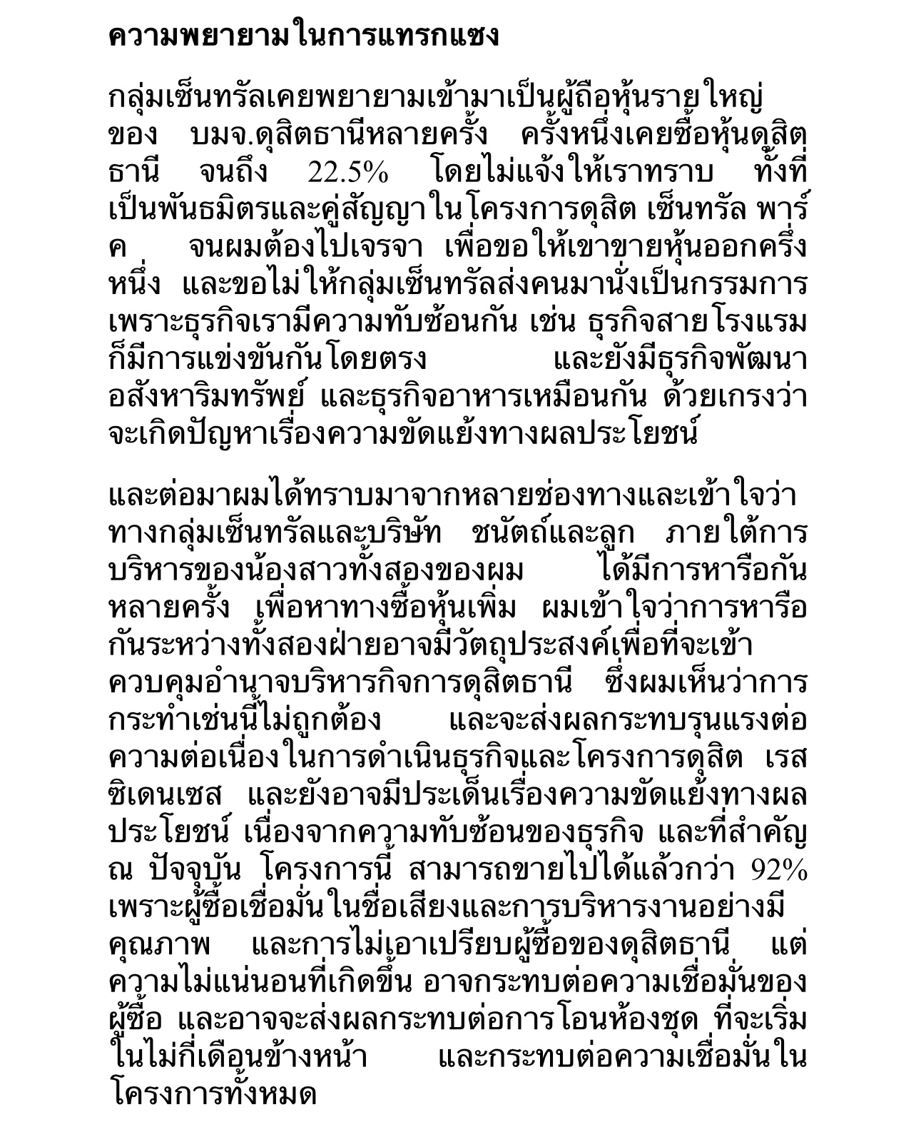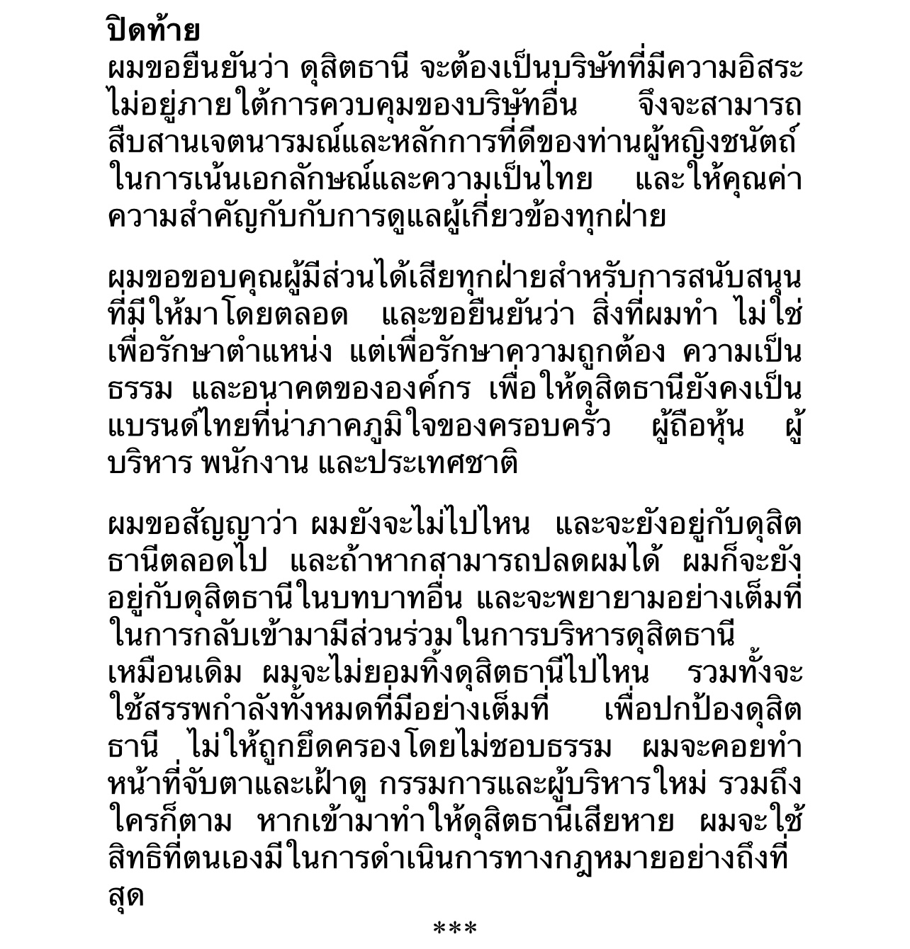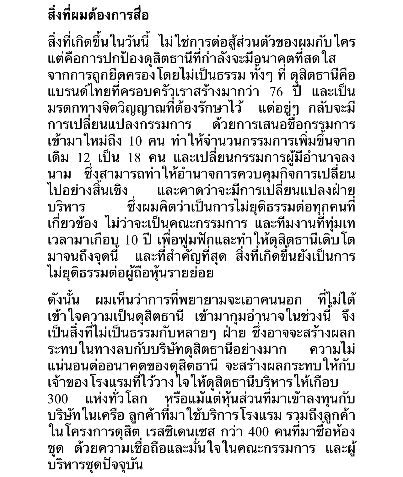 - ยืนยันจะไม่ทิ้งดุสิตธานี ไม่ว่าถูกปลดออกหรือไม่ และพร้อมใช้สิทธิกฎหมายเต็มที่
