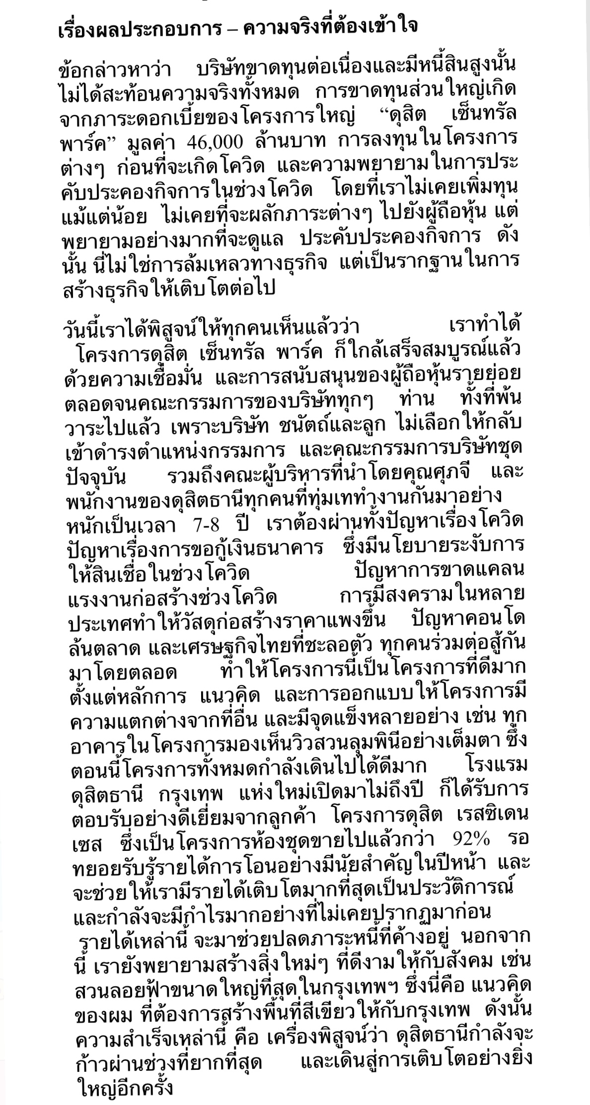 - ขาดทุนหลัก ๆ มาจาก ภาระดอกเบี้ยโครงการ Dusit Central Park มูลค่า 46,000 ล้านบาท และวิกฤตโควิด แต่ไม่เคยเรียกเพิ่มทุนสักครั้ง ไม่อยากรบกวนผู้ถือหุ้น