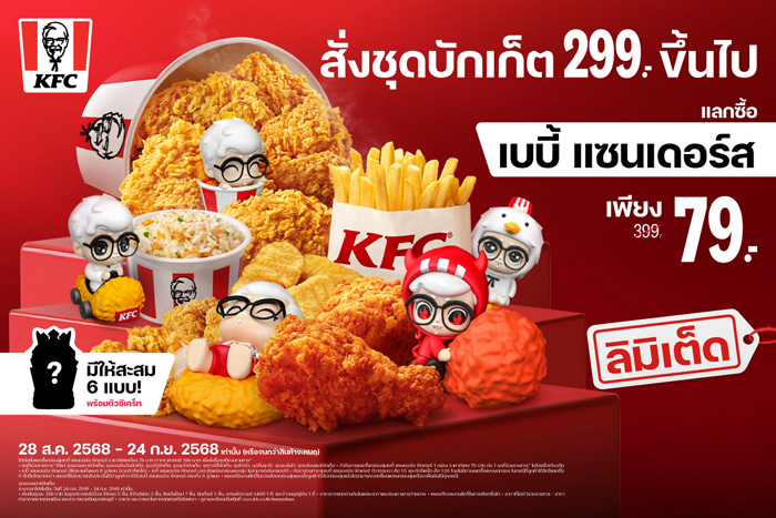 KFC ประเทศไทยฉลองเดือนเกิดผู้พันปีนี้อย่างยิ่งใหญ่ เปิดตัวกล่องสุ่มลิมิเต็ดสุดคิวท์ “เบบี้ แซนเดอร์ส คอลเลกชัน” (KFC BABY SANDERS COLLECTION) เมื่อผู้พันแซนเดอร์สแปลงร่างมาเป็นฟิกเกอร์สุดน่ารักในหลากหลายลุคให้แฟนๆ ได้สะสมกันถึง 6 คาแรกเตอร์ ในราคาแลกซื้อสุดพิเศษเพียงกล่องสุ่มละ 79 บาท ตั้งแต่ 28 สิงหาคม – 24 กันยายน 2568 (หรือจนกว่าสินค้าจะหมด) พร้อมสร้างประสบการณ์สุดพิเศษ ให้ทุกคนได้ร่วมฉลองวันเกิดผู้พันแซนเดอร์สอย่างยิ่งใหญ่ ขนขบวนฟิกเกอร์ไซซ์ยักษ์ สูงกว่า 2.7 เมตร ทั้ง 6 คาแรกเตอร์เดินสายโชว์ตัวทั่วกรุง ให้แฟนๆ ได้แชะรูปตลอดทั้งเดือนกันยายนนี้ เก็บโมเมนต์เริ่มที่แรก Discovery Plaza สยามเซ็นเตอร์ ตอกย้ำภาพลักษณ์ KFC ในฐานะแบรนด์ที่เข้าใจอินไซต์ผู้บริโภค และจับ Pop Culture มาตีความในสไตล์ที่สนุก เข้าถึงง่าย และเต็มไปด้วยเอกลักษณ์ที่ไม่เหมือนใคร