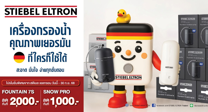 สตีเบล เอลทรอน (Stiebel Eltron) จัดโปรโมชันผลิตภัณฑ์ เครื่องกรองน้ำดื่มรุ่นยอดนิยม พิเศษ! รับส่วนลด 2,000 บาท สำหรับ ‘FOUNTAIN 7S’ เครื่องกรองน้ำดื่มระบบ UF ที่กรองถึง 7 ขั้นตอน ขนาดกะทัดรัด ติดตั้งง่าย และส่วนลด 1,000 บาท สำหรับ ‘SNOW PRO’ เครื่องกรองน้ำดื่มระบบ RO ที่มาพร้อมประสิทธิภาพการกรอง 6 ขั้นตอนใน 2 ไส้กรอง เมื่อซื้อสินค้าผ่านห้างสรรพสินค้า ตัวแทนจำหน่าย และช่องทางออนไลน์ ระหว่างวันนี้ – 30 กันยายน 2568 ติดตามกิจกรรมและข้อมูลข่าวสารเพิ่มเติมได้ทางอินสตาแกรม @stiebeleltronth เฟซบุ๊ก STIEBEL ELTRON Thailand เว็บไซต์ https://www.stiebel-eltron.co.th/ ไลน์ออฟฟิเชียล @stiebeleltronth หรือโทร 035 905 000