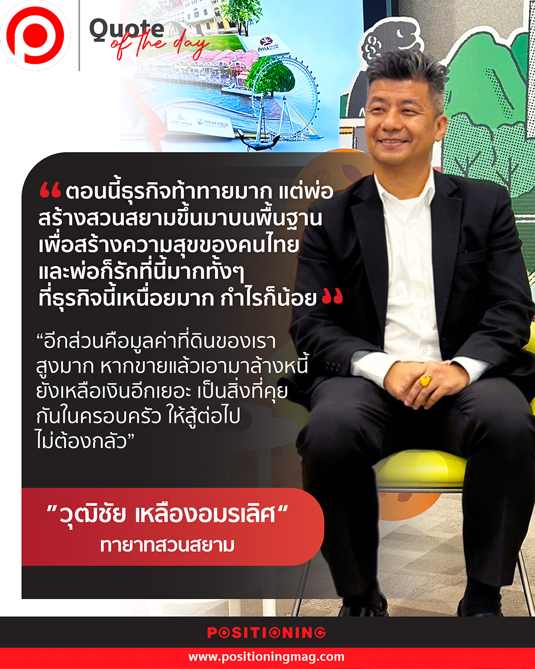 แม้จะมีความท้าทายรออยู่ข้างหน้ามากมาย และภาวะเศรษฐกิจมีแนวโน้มไม่ดีนัก แต่ทายาทสวนสยามยืนยันจะเดินหน้าธุรกิจนี้ต่อไปเพื่อสร้างความสุขให้คนไทย ตามความตั้งใจของผู้ก่อตั้งซึ่งเป็นคุณพ่อของเขาอย่าง ‘ดร.ไชยวัฒน์ เหลืองอมรเลิศ’