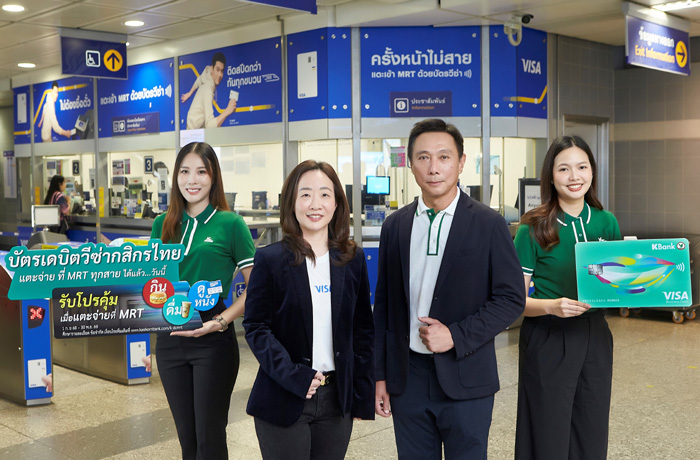 ธนาคารกสิกรไทย ร่วมมือการรถไฟฟ้าขนส่งมวลชนแห่งประเทศไทย (รฟม.) บริษัท ทางด่วนและรถไฟฟ้ากรุงเทพ จำกัด (มหาชน) (BEM) และวีซ่า ยกระดับการใช้ชีวิตคนเมืองให้เดินทางง่าย สะดวก รวดเร็ว และปลอดภัย ด้วยการเชื่อมต่อระบบการรับชำระเงินขนส่งสาธารณะผ่านบัตรเดบิตวีซ่ากสิกรไทย ให้สามารถแตะจ่ายค่าโดยสารรถไฟฟ้า MRT ได้ทุกสาย โดยไม่ต้องเสียเวลาเติมเงิน รวมทั้งครอบคลุมการชำระเงินระบบขนส่งสาธารณะอื่นๆ ทั้งรถไฟฟ้าแอร์พอร์ต เรล ลิงก์ ทางด่วน รถโดยสารประจำทาง ขสมก. และยังใช้แตะจ่ายที่สถานีบริการน้ำมันได้อีกด้วย โดยตั้งเป้าปริมาณการใช้จ่ายผ่านบัตรเดบิตกสิกรไทยในหมวดขนส่งสาธารณะเติบโตขึ้นอย่างต่อเนื่อง โดยเฉพาะการแตะจ่ายที่สถานีรถไฟฟ้า MRT คาดว่าจะเติบโตกว่า 9 เท่า
