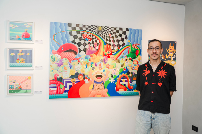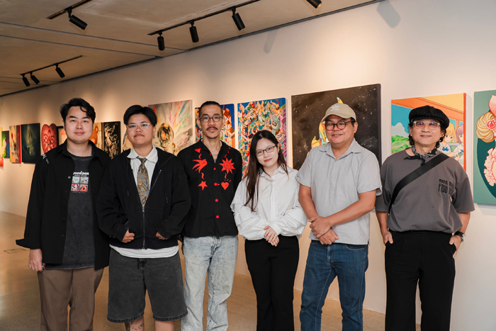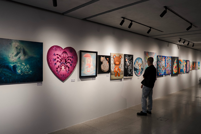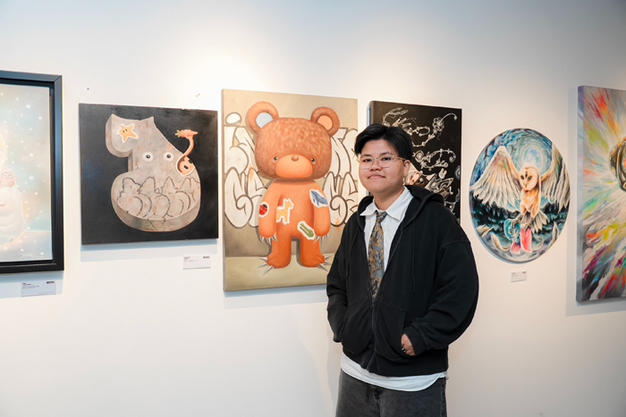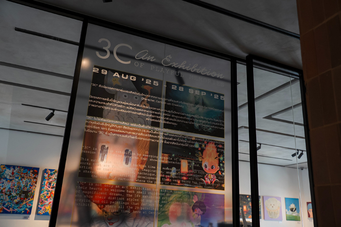 “3C” ย่อมาจาก Character – Cartoon – Creativity เป็นนิทรรศการที่รวบรวมศิลปินรุ่นใหม่หลากหลายแนว ผู้ปลดปล่อยพลังสร้างสรรค์ในรูปแบบความเป็นตัวตนอย่างแท้จริง แม้แต่ละคนจะมีลายเส้น เทคนิค และมุมมองที่แตกต่างกัน ทว่าทั้งหมดกลับมีจุดร่วมเดียวกันคือการใช้คาแรคเตอร์และการ์ตูนเป็นสื่อกลางในการบอกเล่าเรื่องราวส่วนตัวได้อย่างลุ่มลึกชวนผู้ชมย้อนกลับไปยังช่วงเวลาแห่งความสุขในวัยเยาว์ ผ่านผลงานที่เต็มไปด้วยอารมณ์ขัน จินตนาการ และความทรงจำที่เคลื่อนไหว ซึ่งถูกถ่ายทอดผ่านงานจิตรกรรม (Painting) บนผืนผ้าใบ ทั้งในแบบอะ คริลิกและสีน้ำมัน รวม 29 ชิ้นงาน ที่มีความโดดเด่นทั้งในสไตล์ป๊อปอาร์ต และเซอร์เรียลลิสม์ นิทรรศการนี้จึงไม่ได้เป็นเพียงแค่การจัดแสดงผลงานศิลปะ หากแต่เป็นพื้นที่เปิดใจให้เราทุกคนได้ทบทวนความทรงจำเล็ก ๆ ที่ครั้งหนึ่งเคยจุดประกายความฝันอันยิ่งใหญ่