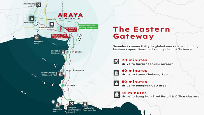 อารยะ ดิ อีสเทิร์น เกตเวย์ (ARAYA – The Eastern Gateway) เปิดพื้นที่โครงการด้วยแนวคิด “ระบบนิเวศเมืองอุตสาหกรรมและนวัตกรรมครบวงจรรูปแบบใหม่ของประเทศไทย” (Thailand’s First Industrial-Tech Ecosystem) ที่ออกแบบอย่างพิถีพิถันเพื่อรองรับการเติบโตของอุตสาหกรรม S-Curve พร้อมยกระดับสู่ “Township” อุตสาหกรรมอัจฉริยะ ที่ผสานการบริหารจัดการนิคมฯ เทคโนโลยี และคุณภาพชีวิตเข้าด้วยกันอย่างไร้รอยต่อ ตอกย้ำบทบาทการเป็นผู้บุกเบิกนิคมอุตสาหกรรมอัจฉริยะของประเทศ