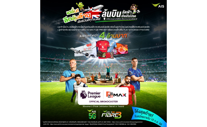 สามารถลุ้นเป็นผู้โชคดีที่จะได้ไปสัมผัสบรรยากาศการแข่งขันแบบสด ๆ ที่ประเทศอังกฤษ เพียงสมัครแพ็กเกจ PLAY MONOMAX Standard รายเดือน ราคา 199 บาท สมัครกด *899 โทรออก และรายปี ราคา 1,999 บาท สมัครกด *899*1 โทรออก หรือ สมัครแพ็กเกจรายเดือน 5G MAX PLAY PREMIER สำหรับลูกค้าย้ายค่าย, เปิดเบอร์ใหม่ และเปลี่ยนจากเติมเงินเป็นรายเดือน ตั้งแต่วันนี้ – 15 กันยายน 2568 โดยจะประกาศรายชื่อผู้โชคดีทุกวันพฤหัสบดี และประกาศรางวัลใหญ่สุดพิเศษ ตั๋วเครื่องบินเที่ยวชมสนามฟุตบอลประเทศอังกฤษพร้อมดูบอลนัดพิเศษ ในวันที่ 16 ตุลาคม 2568 ที่ https://www.ais.th/consumers/package/exclusive-plan/premier-league-luckydraw