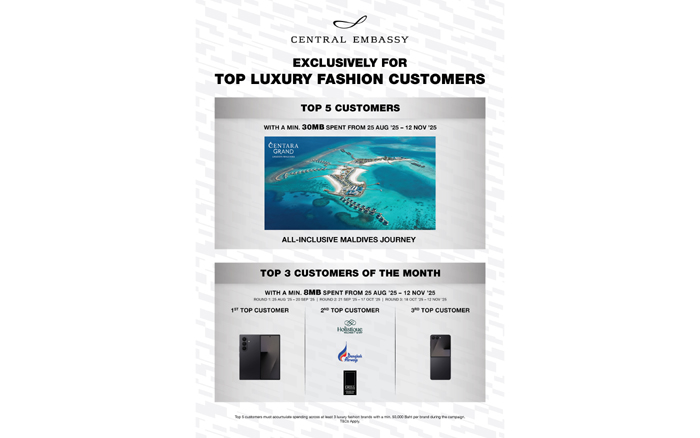 เซ็นทรัล เอ็มบาสซี ชวนสัมผัสประสบการณ์การช้อปที่สะท้อนรสนิยมและสไตล์อันเป็นเอกลักษณ์ กับ “Top Luxury Fashion Customers” ซึ่งถูกรังสรรค์ขึ้นเป็นพิเศษเพื่อตอบแทนนักสะสมผลงานแฟชั่นและจิวเวลรี่ระดับโลกโดยเฉพาะ โดยมอบรางวัลสุดเอ็กซ์คลูซีฟที่คัดสรรมาอย่างพิถีพิถัน สำหรับลูกค้าผู้มีรสนิยมโดดเด่น ตั้งแต่วันที่ 25 ส.ค. 68 ถึง 12 พ.ย. 68 โดยสามารถนำใบเสร็จจากร้านค้าชั้นนำที่ร่วมรายการมาสะสมยอดซื้อ ได้แก่ Balenciaga, Bottega Veneta, Burberry, Chanel, Christian Louboutin, Gucci, Hermès, Maison Margiela, Mugler (Pop-up), Prada, Rene Caovilla, Saint Laurent, Versace, Van Cleef & Arpels และ Zegna