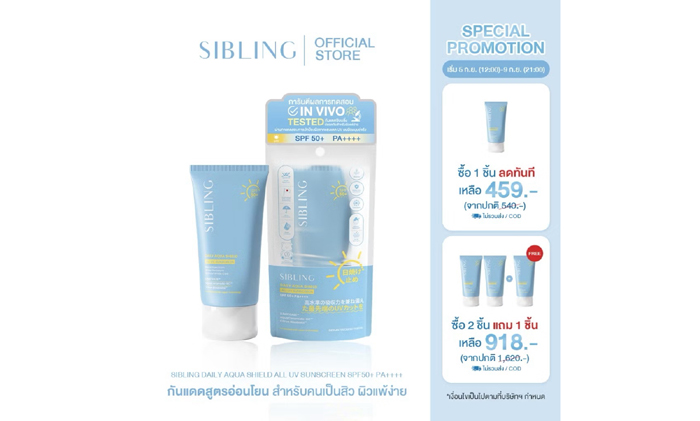 และสำหรับวันที่ 5-9 กันยายนนี้ จะเป็นอีกหนึ่งก้าวสำคัญของ Sibling ในการนำ ครีมกันแดด มาจัดโปรโมชันครั้งแรก ด้วยโปรโมชัน ซื้อสินค้า 1 ชิ้น ราคา 459 บาท หากซื้อ 2 ชิ้นแถม 1 ชิ้นในราคา 918 บาท