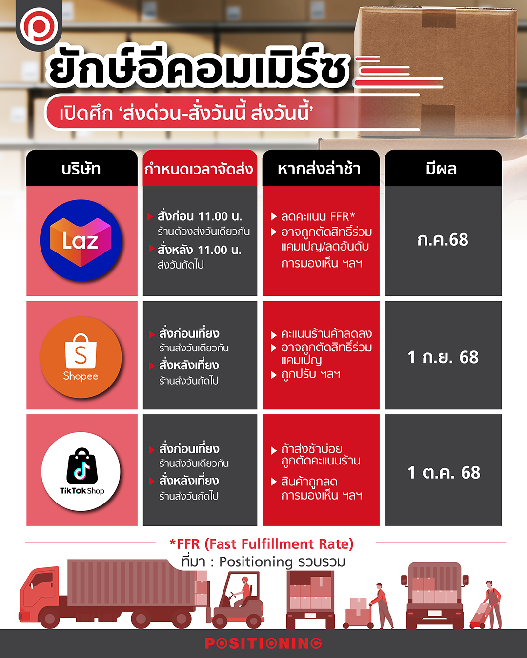ตอนนี้บรรดายักษ์ใหญ่อีคอมเมิร์ซทั้ง Lazada, Shopee และ TikTok Shop ต่างเปิดศึก ‘ส่งด่วน’ กำหนดกรอบเวลาการจัดส่งใหม่ ‘สั่งวันนี้ ส่งวันนี้’ โดยให้เหตุผล ‘ทำเพื่อผู้บริโภค’ อย่างไรก็ตามได้เกิดเสียงวิพากษ์วิจารณ์ว่า กฎใหม่นี้เป็นการเพิ่มภาระและส่งกระทบต่อ ‘ร้านค้า’ ซึ่งเป็นผู้ขายหรือไม่
