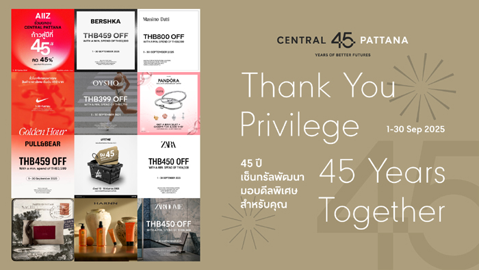 สุดพิเศษ! ศูนย์การค้าเซ็นทรัลร่วมกับพันธมิตรชั้นนำ มอบสิทธิพิเศษและโปรโมชั่นแทนคำขอบคุณลูกค้าที่อยู่เคียงข้างกันมาตลอด 45 ปี อาทิ ส่วนลดสูงสุด 45% จากแบรนด์แฟชั่นและไลฟ์สไตล์ชั้นนำ, สิทธิพิเศษและเซ็ทเมนูสุดเอ็กซ์คลูซีฟจากร้านอาหารกว่า 10 แบรนด์, ของขวัญลิมิเต็ดเอดิชั่น และสิทธิพิเศษสำหรับสมาชิก The1 ที่ร้านพันธมิตร ตั้งแต่วันนี้ถึง 30 กันยายน 2568 (เฉพาะร้านค้าและสาขาที่ร่วมรายการในศูนย์การค้าเซ็นทรัลเท่านั้น)