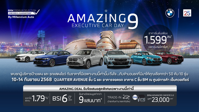 บริษัท มิลเลนเนียม ออโต้ กรุ๊ป จำกัด ผู้จำหน่ายรถยนต์ บีเอ็มดับเบิลยู, มินิ และ มอเตอร์ไซค์ บีเอ็มดับเบิลยู มอเตอร์ราด อย่างเป็นทางการในประเทศไทย ภายใต้บริษัท มิลเลนเนียม กรุ๊ป คอร์ปอเรชั่น (เอเชีย) จำกัด (มหาชน) หรือ MGC-ASIA สร้างปรากฏการณ์ครั้งสำคัญ จัดมหกรรม ‘AMAZING 9 EXECUTIVE CAR DAY’ ที่สุดแห่งการรวมตัวของรถผู้บริหาร บีเอ็มดับเบิลยู, มินิ และมอเตอร์ไซค์ บีเอ็มดับเบิลยู มอเตอร์ราด รวมกว่า 50 คัน ครบทุกเซกเมนต์ มาจัดแสดงพร้อมจำหน่าย ภายใต้ราคาสุดพิเศษแบบไม่เคยมีมาก่อน ระหว่างวันที่ 10–14 กันยายน 2568 QUARTIER AVENUE ชั้น G และอาคารจอดรถ อาคาร C ชั้น BM ศูนย์การค้า เอ็มควอเทียร์ หรือรับสิทธิพิเศษสำหรับยนตรกรรม บีเอ็มดับเบิลยู ทุกรุ่น ได้ที่โชว์รูม บีเอ็มดับเบิลยู มิลเลนเนียม ออโต้ และ มินิ มิลเลนเนียม ออโต้ ทุกสาขาทั่วประเทศ
