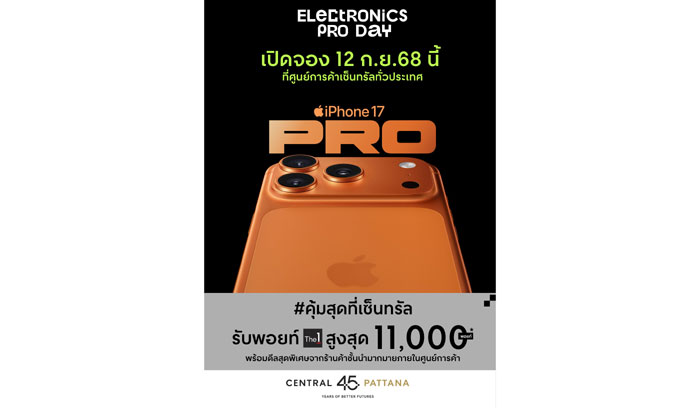 ถ้าไม่จองที่เซ็นทรัล…บอกเลยว่าพลาดมาก!บริษัท เซ็นทรัลพัฒนา จำกัด (มหาชน) พร้อมพาสาวกแอปเปิ้ลสัมผัสประสบการณ์เป็นเจ้าของ iPhone 17 Series ก่อนใคร กับแคมเปญ “Electronics Pro Day 2025” ที่ยกทัพพันธมิตรตัวจริง iStudio by Copperwired, iStudio by SPVi, Studio7, Apple Store, dotlife, TG, Advice, IT CITY, JAYMART, BaNANA, Power Buy, AIS, TRUE และอีกมากมาย มามอบข้อเสนอที่ดีที่สุดให้ครบในที่เดียวเริ่ม 12 กันยายน – 9 พฤศจิกายน 2568