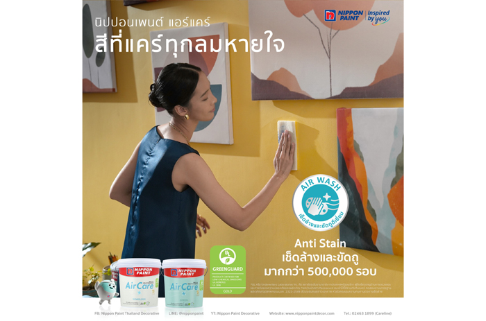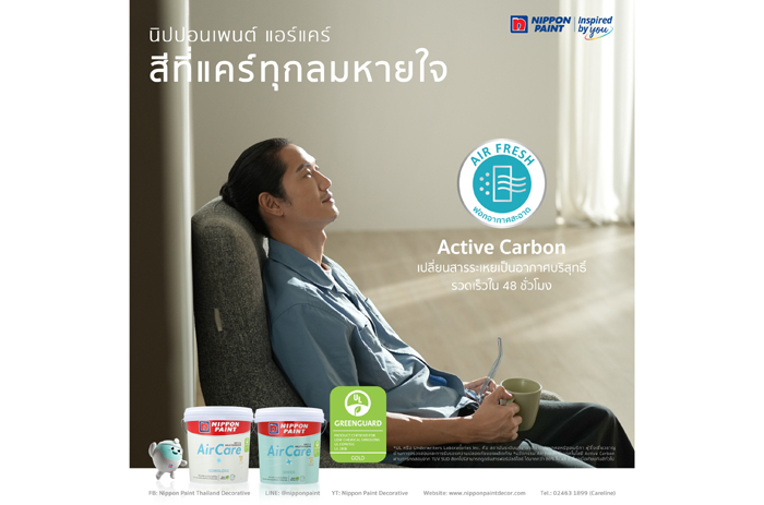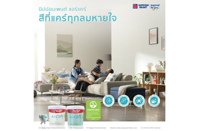 “นิปปอนเพนต์” แบรนด์สีนวัตกรรมยอดขายอันดับ 1 ของเอเชียจากประเทศญี่ปุ่น ย้ำภาพลักษณ์จุดยืนสำคัญของ “นิปปอนเพนต์ แอร์แคร์” ( Nippon Paint AirCare) ในฐานะสุดยอดสีนวัตกรรมทาภายในเพื่อสุขภาพ เกรดอัลตร้าพรีเมียม รายแรกในไทยกับตรารับรองระดับโลก GREENGUARD GOLD จากสถาบัน UL สหรัฐอเมริกา การันตีอากาศภายในห่างไกลสารระเหย (Zero VOCs) เสมือนเป็นตัวช่วยผู้ดูแลอากาศในบ้านให้สะอาดกว่า เสริมสุขภาพที่ดีขึ้นให้กับทุกชีวิตกับคำมั่น “สีที่แคร์ทุกลมหายใจ” โดยครั้งนี้ นิปปอนเพนต์ แอร์แคร์ มาพร้อมอีกหนึ่งความเหนือกว่ากับบทบาทการเป็น “Lifestyle Interior Paint” ซึ่งเข้าใจไลฟ์สไตล์ของผู้อยู่อาศัยทุกรูปแบบอย่างแท้จริง ด้วยความหลากหลายของสีสันที่ช่วยให้ผู้ใช้ได้สะท้อนตัวตนตามต้องการ โดยนิปปอนเพนต์เริ่มสื่อสารภาพลักษณ์ ดังกล่าวผ่านอินเทอร์เน็ตฟิล์มเรื่องใหม่กับ “คนรักสุขภาพ” และ “ทุกคนที่มองหาสีสันที่ใช่ เพื่อแสดงอัตลักษณ์จากภายในสู่ที่อยู่อาศัย” เพื่อส่งให้ “นิปปอนเพนต์ แอร์แคร์” ขึ้นแท่นเป็นสีนวัตกรรมทาภายในที่หนึ่งในใจของทุกคน