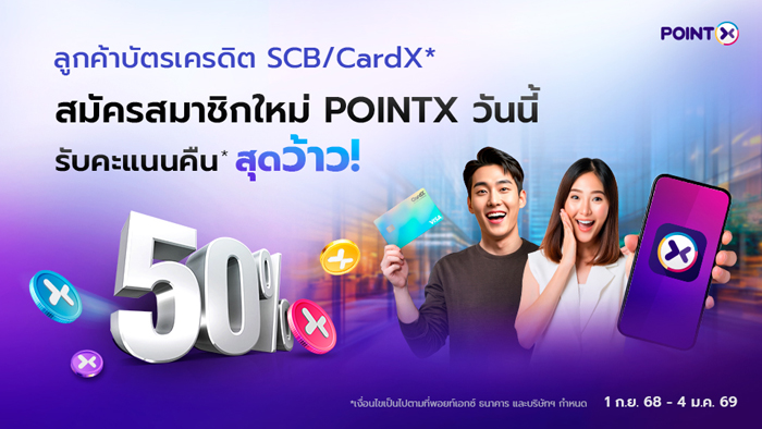 POINTX แอปพลิเคชันรวมและแลกคะแนนสะสม ที่แลกง่าย ใช้คุ้ม เดินหน้ามอบความคุ้มค่าในการใช้คะแนน ด้วยแคมเปญ “POINTX Point Back – สมัครสมาชิกใหม่ POINTX วันนี้ รับคะแนนคืนสุดว้าว” เพียงดาวน์โหลดและลงทะเบียนการใช้แอปฯ POINTX ผ่านแอปฯ SCB EASY พร้อมแลกคะแนนบนแอปฯครั้งแรก* รับโบนัสคะแนนคืนถึง 50% สูงสุดถึง 5,000 POINTX สิทธิพิเศษเฉพาะลูกค้าบัตรเครดิต SCB และบัตรเครดิต CardX จำกัด 500 สิทธิ์ต่อสัปดาห์ แคมเปญเริ่มตั้งแต่วันที่ 1 กันยายน 2568 – 4 มกราคม 2569