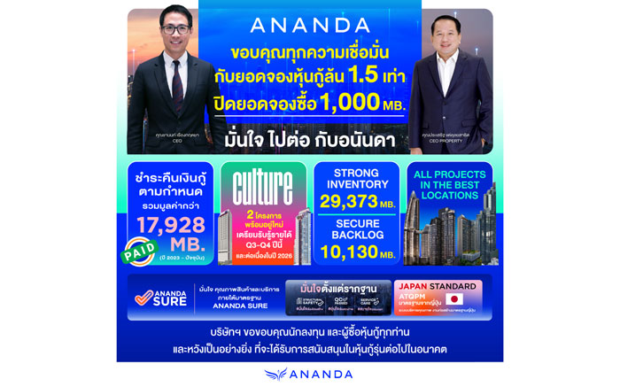 บริษัท อนันดา ดีเวลลอปเม้นท์ จำกัด (มหาชน) หรือ ANAN ประกาศความสำเร็จในการเสนอขายหุ้นกู้ชุดใหม่ อายุ 1 ปี อัตราดอกเบี้ย 6.75% ต่อปี จ่ายดอกเบี้ยทุก 3 เดือน เป็นหุ้นกู้มีหลักประกันมูลค่าไม่ต่ำกว่า 1.5 เท่าของยอดหุ้นกู้ที่ออกและเสนอขายได้ ให้แก่นักลงทุนสถาบัน และ/หรือนักลงทุนรายใหญ่ ได้รับกระแสตอบรับดีเกินคาด มียอดแจ้งความประสงค์จองซื้อสูงถึง 1.5 เท่าของวงเงินที่เสนอขาย ทำให้สามารถปิดยอดจองซื้อไปได้เต็มจำนวน 1,000 ล้านบาท สะท้อนถึงความเชื่อมั่นของนักลงทุนที่มีต่อศักยภาพการดำเนินงาน และพื้นฐานทางการเงินของบริษัทฯ ท่ามกลางสถานการณ์ความผันผวนของตลาดตราสารหนี้ไทย