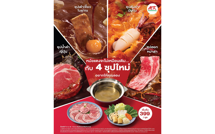 ในครั้งนี้ “หม้อแดง หม้อเดิม” พร้อมที่จะพาทุกคนเปิดโลกการกินสุกี้รสชาติใหม่ จากเดิมที่เคยกินแต่ซุปใส แต่ครั้งนี้คุณจะได้รสชาติใหม่ที่หลากหลายกว่าเดิม เพราะยกความอร่อยมากับ 4 รสชาติใหม่ “ซุปต้มยำมันกุ้ง” แซ่บซี๊ด จัดจ้าน สไตล์ไทย, “ซุปเต้าเจี้ยวโบราณ” หอม กลมกล่อมสไตล์จีน, “ซุปน้ำดำญี่ปุ่น” No.1 เรื่องอูมามิ และ “ซุปฮอทหม่าล่า” เผ็ดชาไฟลุก สไตล์เสฉวน เสิร์ฟพร้อมเนื้อ หมู หรือซีฟู้ด และผักคุณภาพดีในสไตล์ MK เสิร์ฟครบชุดในราคาเริ่มต้นเพียง 399 บาท/ชุด พร้อมประสบการณ์ใหม่ตั้งแต่การเสิร์ฟ