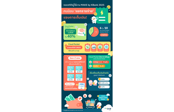 จากข้อมูลการใช้งานแอปพลิเคชัน MAKE by KBank พบว่าประเภท Cloud Pocket หรือ “กระเป๋าย่อย” ที่ได้รับความนิยมสูงสุดในปีนี้ ได้แก่ “เงินใช้รายวัน/สัปดาห์/เดือน” “เงินค่าการเดินทาง” “เงินเพื่อจ่ายหนี้” และ “ค่าเบี้ยประกัน” แทนที่ประเภท “เงินเก็บ” ซึ่งเคยเป็น Cloud Pocket ประเภทยอดนิยมในปี 2567 โดย 6 ใน 10 ของ Cloud Pocket ที่ถูกสร้างขึ้นจะเกี่ยวกับ “รายจ่าย” เช่น ค่าอาหาร ค่าน้ำ และค่าไฟ ส่วน Cloud Pocket ที่มีการเติบโตอย่างก้าวกระโดดเมื่อเทียบกับปีที่ผ่านมา ได้แก่ หมวดค่าที่อยู่อาศัย ที่มีการสร้างเพิ่มขึ้นถึง 9 เท่า และหมวดเกี่ยวกับกิจกรรมวิ่ง เช่น “รองเท้า” หรือ “มาราธอน” ที่โตขึ้นกว่า 3 เท่า ซึ่งการแบ่งเงินก่อนใช้ด้วย Cloud Pocket ไม่เพียงแต่ช่วยให้ผู้ใช้ควบคุมรายจ่ายได้ดีขึ้น แต่ยังมีผลต่อการออมโดยตรง ผู้ใช้สามารถสร้างกระเป๋าเงินแยกได้ไม่จำกัดตามเป้าหมายได้อย่างอิสระ ไม่ว่าจะแบ่งเก็บออม หรือแบ่งใช้ตามค่าใช้จ่ายที่มี จากสถิติสะท้อนว่า ผู้ที่ใช้ Cloud Pocket สามารถเก็บเงินได้มากกว่าผู้ที่ไม่มี Cloud Pocket ถึง 40% โดยกลุ่ม Gen Z นิยมแบ่งเงินแบบรายสัปดาห์ ขณะที่ Gen Y เลือกจัดการแบบรายเดือน