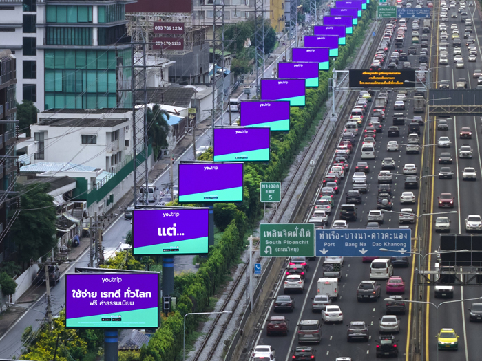 สำหรับแคมเปญสื่อโฆษณานอกบ้าน (OOH) ครั้งนี้สร้างสีสันทั่วกรุงเทพฯ ด้วยบิลบอร์ดกว่า 74 จอ ที่เรียงขนานสองฝั่งบนทางด่วนเฉลิมมหานคร จุดกระแสความสงสัยและถูกพูดถึงอย่างกว้างขวางในโลกออนไลน์ ช่วงแรกป้ายเผยเพียงข้อความสั้น ๆ ที่ชวนให้ติดตาม โดยมีถึง 66 จอที่ยังว่างเปล่าไร้ข้อความ ก่อนเฉลยเป็นประโยคสำคัญ “เรทดี ไม่มีแต่” ซึ่งช่วยตอกย้ำภาพลักษณ์ YouTrip ในฐานะแบรนด์ที่กล้านำเสนอความต่าง และยืนหยัดในจุดยืน “โปร่งใส และไม่มีเงื่อนไขซ่อน”