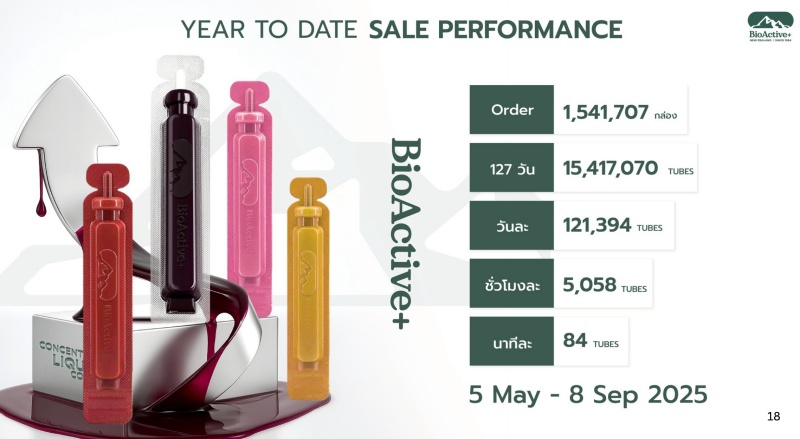 BioActive+ เปิดตัวมาได้ 4 เดือน ตั้งแต่ 5 พฤษภาคม– 9 กันยายน 2568 สามารถทำยอดขาย 921 ล้านบาท มียอดคำสั่งซื้อสิ้นค้าทั้งหมด 1,541,707 กล่อง หรือจัดจำหน่ายไปแล้วมากกว่า 15 ล้านหลอด คิดเป็นวันละ 121,394 หลอด ชั่วโมงละ 5,058 หลอด นาทีละ 84 หลอด