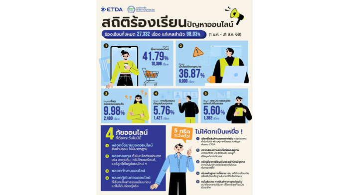 สำนักงานพัฒนาธุรกรรมทางอิเล็กทรอนิกส์ (สพธอ.) หรือ ETDA (เอ็ตด้า) เผยสถิติร้องเรียนปัญหาออนไลน์ จากศูนย์ช่วยเหลือและจัดการปัญหาออนไลน์ หรือ 1212 ETDA ระหว่างเดือน ม.ค.-ส.ค. 68 พบปัญหาร้องเรียนออนไลน์ 27,332 เรื่อง เพิ่มขึ้นจากปี 67 ในช่วงเวลาเดียวกันถึง 4,574 เรื่องหรือร้อยละ 20.10 โดย ‘ปัญหาซื้อขายออนไลน์-เว็บไซต์ผิดกฎหมาย’ ยังคงครองแชมป์ร้องเรียนมากสุด ขณะที่ กว่าร้อยละ 98.03 หรือ 26,794 เรื่อง ได้รับการช่วยเหลือและแก้ปัญหาแล้ว พร้อมเร่งเครื่องปิดช่องโหว่มิจฉาชีพ ด้วย ‘กลไกร่วมกำกับภายใต้กฎหมาย DPS – สร้างคุ้มกันคนไทยรู้ทันภัยออนไลน์’