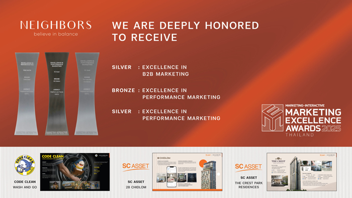 Neighbors Agency (เนเบอร์ส เอเจนซี่) ผู้เชี่ยวชาญการขับเคลื่อนด้วยการแก้ปัญหาบนกลยุทธ์ทางธุรกิจประกาศความสำเร็จครั้งสำคัญบนเวที Marketing Excellence Awards Thailand 2025 โดยสามารถคว้า 3 รางวัล ซึ่งสะท้อนให้เห็นถึงความมุ่งมั่นในการสร้างสรรค์ผลงานที่โดดเด่น จับมือไปกับลูกค้า ตอบโจทย์ลูกค้าและตลาดได้อย่างมีประสิทธิภาพ พร้อมให้ธุรกิจของลูกค้าเติบโตตามโลกที่เปลี่ยนแปลง