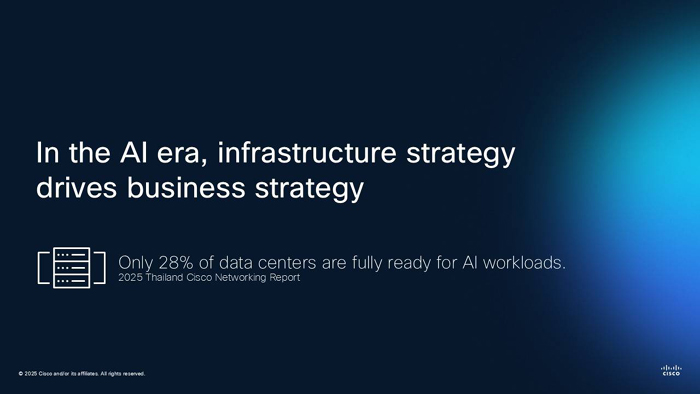 งาน AI ในปัจจุบันต้องการประสิทธิภาพจากเครือข่ายมากกว่าที่โครงสร้างแบบเดิมจะรองรับได้ จากผลการศึกษา Cisco’s 2025 Networking Report ผู้นำด้านไอทีไทยมองว่า ดาต้าเซ็นเตอร์ ‘น้อยกว่าหนึ่งในสาม’ ได้รับการปรับให้เหมาะสมกับงาน AI ที่มีความสามารถขั้นสูง ด้วยความจุศูนย์ข้อมูลของไทยที่คาดว่าจะขยายตัวสามเท่าใน 3 ปีข้างหน้า[1] องค์กรไทยจำเป็นต้องปรับเปลี่ยนวิธีการออกแบบ ขยายขนาด และรักษาความปลอดภัยของโครงสร้างพื้นฐานเพื่อรองรับความต้องการด้าน AI