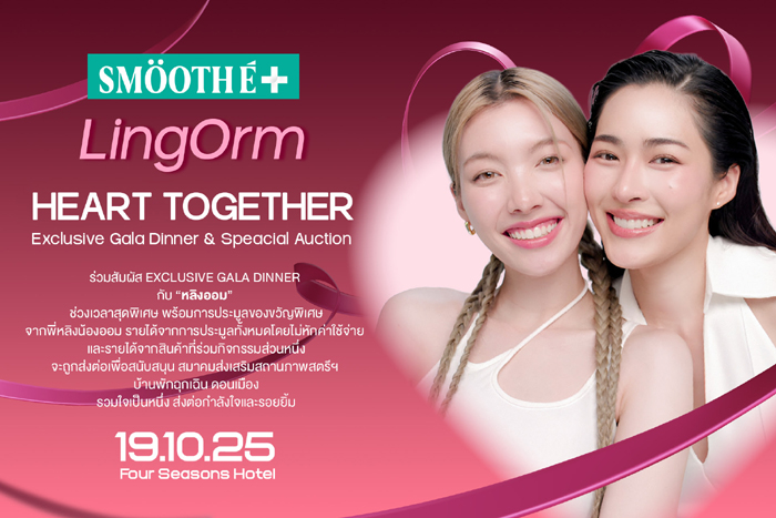 สมูทอี โดยบริษัท สยามเฮลท์ กรุ๊ป จำกัด แบรนด์เวชสำอางสำหรับผิวบอบบางแพ้ง่ายที่ได้รับความไว้วางใจมากว่า 30 ปีและครองยอดขายอันดับ 1 ในร้านขายยา เปิดตัวแคมเปญการตลาดเพื่อช่วยเหลือสังคมครั้งใหญ่แห่งปี “Smooth E Heart Together” จับมือหลิง-ออม เชิญชวน “เจ้าความรัก” และแฟน ๆ สมูทอี ร่วมส่งต่อกำลังใจและรอยยิ้มให้ผู้หญิง เดินหน้าจัดเต็มงานการกุศลสุดพิเศษที่มีชื่อว่า “Heart Together Exclusive Gala Dinner & Special Auction With LingOrm” มอบโอกาสให้ผู้โชคดี 40 Top Fans ของสมูทอีเข้าร่วมสัมผัสประสบ การณ์กาล่าดินเนอร์สุดเอ็กซ์คลูซีฟกระทบไหล่หลิงออม พร้อมประมูลของขวัญพิเศษจากพี่หลิงน้องออม เพื่อหารายได้สมทบทุนสมาคมส่งเสริมสถานภาพสตรี ในพระอุปถัมภ์ พระเจ้าวรวงศ์เธอ พระองค์เจ้าโสมสวลี กรมหมื่นสุทธนารีนาถ บ้านพักฉุกเฉิน ดอนเมือง ซึ่งจะมีขึ้นในวันที่ 19 ตุลาคม 2568 ณ โรงแรมโฟร์ซีซั่นส์ กรุงเทพฯ
