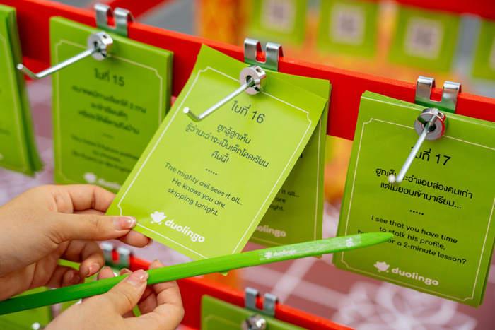 ผู้เข้าร่วมงานสามารถเข้าร่วมกิจกรรมสนุก ๆ อาทิ พบกับ Duo ซึ่งเป็นมาสคอตนกฮูกสีเขียวอันเป็นเอกลักษณ์ของ Duolingo ขนาดใหญ่ 5 เมตร เพื่อ “ขอพร” ให้กับการเดินทางการเรียนรู้ หรือเขียนเป้าหมายการเรียนรู้บนต้นไม้อธิษฐานซึ่งได้รับแรงบันดาลใจจากเปลวไฟสตรีค (streak flames) ของ Duolingo ใครก็ตามที่มีสตรีคมากกว่าหนึ่งวันบน Duolingo จะได้รับ “เซียมซี” พิเศษสำหรับการทำนายดวงการเรียนรู้ของพวกเขา