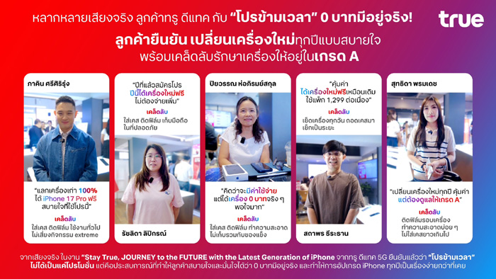 จากเสียงจริงในงาน “Stay True, JOURNEY to the FUTURE with the Latest Generation of iPhone จากทรู ดีแทค 5G ยืนยันแล้วว่า “โปรข้ามเวลา” ของทรู–ดีแทค ไม่ได้เป็นแค่โปรโมชั่น แต่คือประสบการณ์ที่ทำให้ลูกค้าสบายใจและมั่นใจได้ว่า 0 บาทมีอยู่จริงและทำให้การอัปเกรด iPhone ทุกปีเป็นเรื่องง่ายกว่าที่เคย