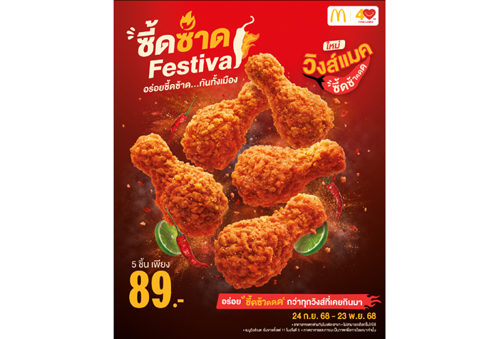 แมคโดนัลด์ เปิดตัวแคมเปญใหม่ ‘ซี้ดซ้าด Festival’ อร่อยซี้ดซ้าดกันทั้งเมือง ท้าให้ลองเมนูใหม่ที่สายแซ่บ สายซี้ด พลาดไม่ได้ กับ 2 เมนูใหม่ ‘วิงส์แมคซี้ดซ้าด’ และ ‘ไก่ทอดแมคซี้ดซ้าด’ เสิร์ฟความอร่อย กรอบนอก ชุ่มฉ่ำใน พร้อมความอร่อยกับผงซี้ดซ้าด ที่เผ็ดซี้ดสะใจถึงรสพริก มะนาว และข้าวคั่ว ยืนยันความอร่อย[1]จากผลสำรวจ ผู้บริโภค 284 คน กว่า 90% คอนเฟิร์มว่า วิงส์แมคซี้ดซ้าดและไก่ทอดแมคซี้ดซ้าด อร่อยกว่าไก่ทอดที่เคยกินมา