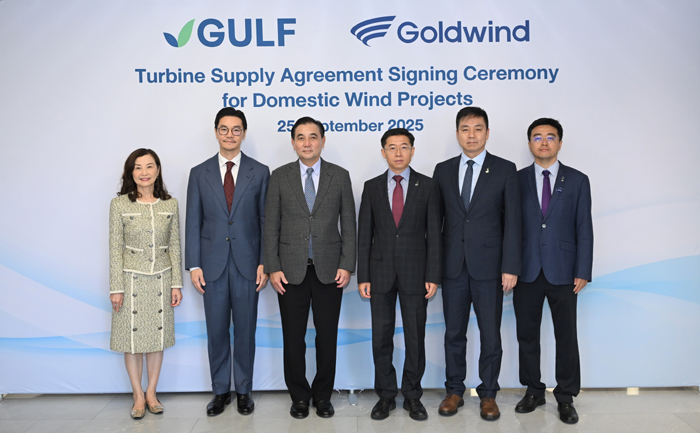 บริษัท กัลฟ์ ดีเวลลอปเมนท์ จำกัด (มหาชน) หรือ GULF นำโดย นายสารัชถ์ รัตนาวะดี (ที่ 3 จากซ้าย) ประธานเจ้าหน้าที่บริหาร ลงนามในสัญญาจัดหากังหันลม (Wind Turbine Supply Agreement) กับบริษัท โกลด์วินด์ อินเตอร์เนชั่นแนล (ฮ่องกง) จำกัด และสัญญาออกแบบ ก่อสร้าง และทดสอบระบบกังหันลม (Wind Turbine Construction Agreement) กับบริษัท โกลด์วินด์ อินเตอร์เนชั่นแนล (ประเทศไทย) จำกัด เพื่อใช้ในการผลิตไฟฟ้าของโครงการโรงไฟฟ้าพลังงานลม 4 โครงการ กำลังการผลิตติดตั้งตามสัญญารวม 286 เมกะวัตต์ (MW) และกำหนดเปิดดำเนินการเชิงพาณิชย์ในปี 2570 โดยมีนายเฉา จื้อกัง (ที่ 4 จากซ้าย) รองประธานกรรมการและประธานเจ้าหน้าที่บริหาร โกลด์วินด์ กรุ๊ป เข้าร่วมลงนามในครั้งนี้