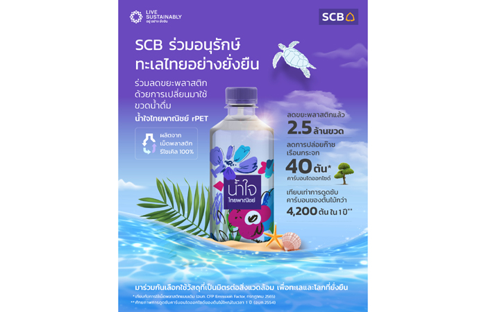 ธนาคารไทยพาณิชย์ร่วมอนุรักษ์ทรัพยากรทางทะเลให้อยู่อย่างยั่งยืน โดยการมีส่วนร่วมช่วยลดขยะพลาสติกจากการใช้ขวดน้ำดื่ม “น้ำใจไทยพาณิชย์ rPET” ไปแล้วกว่า 2.5 ล้านขวด พร้อมเชิญชวนประชาชนร่วมลดขยะพลาสติก และหันมาใช้วัสดุที่เป็นมิตรต่อสิ่งแวดล้อม เพื่อร่วมปกป้องท้องทะเลไทยจากวิกฤตขยะพลาสติกที่กำลังคุกคามชีวิตสัตว์ทะเลและระบบนิเวศอย่างต่อเนื่อง