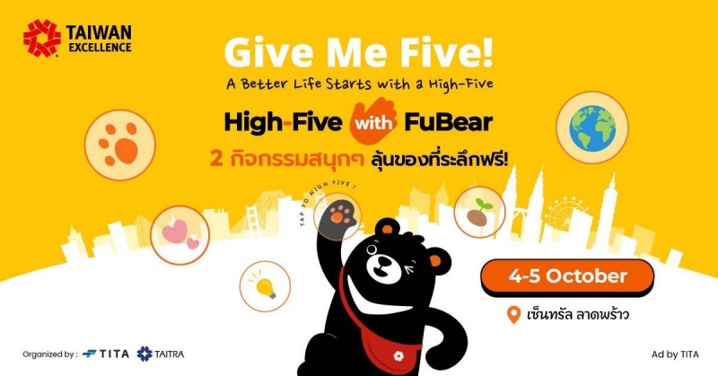ภายในงาน ผู้ร่วมกิจกรรมจะได้สัมผัสบรรยากาศแห่งมิตรภาพผ่านการ High-Five (ไฮ–ไฟว์) กับ FuBear ซึ่งทำหน้าที่เป็นฑูตแบรนด์ Taiwan Excellence พร้อมรับสติ๊กเกอร์ที่ระลึกทันที! นอกจากนี้ ยังมีกิจกรรมพิเศษ ‘Speed High-Five’ เปิดโอกาสให้แฟนๆ ได้ ไฮ–ไฟว์ กับ FuBear ตัวจริง พร้อมรับตุ๊กตาพวงกุญแจ FuBear จำนวนจำกัดเพียง 200 ชิ้นต่อวัน!