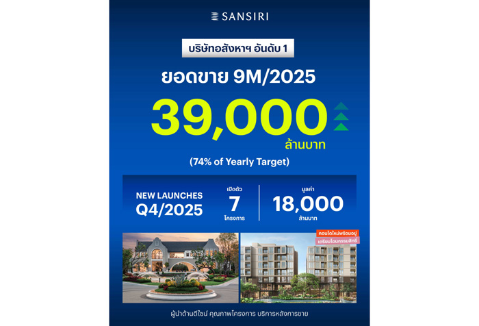 นายวิชาญ วิริยะภูษิต ประธานผู้บริหารสายงานการเงิน บริษัท แสนสิริ จำกัด (มหาชน) หรือ SIRI เปิดเผยยอดขาย 9 เดือนแรก (สิ้นสุด 30 กันยายน 2568) ว่า บริษัทสามารถทำยอดขายได้ตามแผนงานที่ 39,000 ล้านบาท คิดเป็น 74% ของเป้ายอดขายรวมในปี 2568 ที่ตั้งไว้ 53,000 ล้านบาทแม้ภาพรวมตลาดอสังหาริมทรัพย์จะเผชิญความท้าทาย แต่แสนสิริกลับสร้างยอดขายเติบโตเพิ่มขึ้น 5% เมื่อเทียบกับช่วงเดียวกันของปีก่อน (YoY) โดยมีกลุ่มคอนโดมิเนียมเป็นแรงหนุนสำคัญจากการเปิดตัวโครงการใหม่ที่ได้รับผลตอบรับดีเกินคาด
