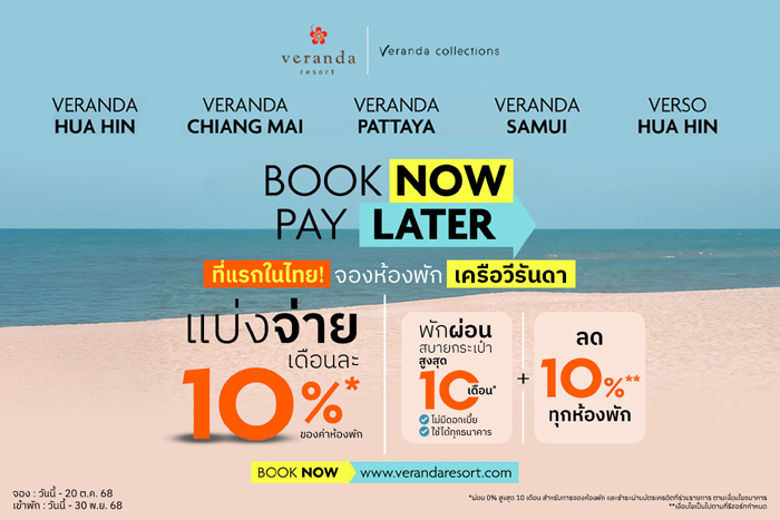 “ภวัฒภ์ องค์วาสิฏฐ์” ซีอีโอ บมจ.วีรันดา รีสอร์ท หรือ VRANDA ผู้ประกอบการโรงแรมและรีสอร์ทภายใต้แบรนด์ วีรันดา จัดแคมเปญ ‘Book Now, Pay Later’ ชวนเก็บกระเป๋าไปฮีลใจก่อนแล้วค่อยแบ่งจ่ายค่าห้องแบบสบายๆ ดอกเบี้ย 0% นานสูงสุด 10 เดือน ผ่านบัตรเครดิตที่ร่วมรายการ โดยไม่มีขั้นต่ำ ซึ่งยังไม่มีโรงแรมไหนเคยให้ขนาดนี้ นอกจากนี้ยังมีส่วนลด On-Top เพิ่มอีก 10% ทุกการจองห้องพักในเครือฯ ทั้งวีรันดา รีสอร์ท และวีรันดา คอลเลกชัน ผ่านเว็บไซต์ www.verandaresort.com เรียกได้ว่าใจป้ำสุดๆ ถือเป็นผู้ประกอบการโรงแรมเจ้าแรกที่ให้ลูกค้าผ่อนได้ยาวๆ โดยไม่มีดอกเบี้ย ช่วยให้คนไทยเที่ยวได้ง่ายขึ้น สายเที่ยวคนไหนที่ปักหมุดเช็คอินโรงแรมหรือรีสอร์ทในเครือวีรันดาฯไว้ในใจต้องรีบหน่อย เพราะเปิดให้จองได้ตั้งแต่วันนี้ – 20 ต.ค.นี้ และเข้าพักได้ถึง 30 พ.ย. 2568 เท่านั้น! (ยกเว้น วีรันดา รีสอร์ท ภูเก็ต และเงื่อนไขเป็นไปตามที่ธนาคารและรีสอร์ทกำหนด)