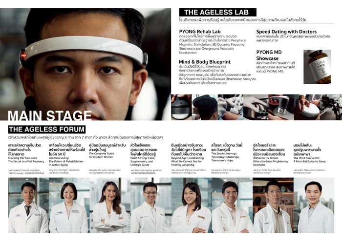“ในยุคที่ประเทศไทยกำลังก้าวเข้าสู่สังคมสูงวัยอย่างสมบูรณ์ (Aged Society) การมีชีวิตที่ยืนยาว (Longevity) อาจไม่ใช่คำตอบสุดท้ายแต่การมี”ช่วงเวลาของชีวิตที่สุขภาพดี” (Healthspan) ที่ยาวนานที่สุดต่างหากคือเป้าหมายสูงสุด งานนี้จึงได้รวบรวมทีมแพทย์ผู้เชี่ยวชาญสหสาขาและนวัตกรด้านสุขภาพเพื่อมอบมุมมองและองค์ความรู้ที่ทันสมัยที่สุดในการ “ถอดรหัส” สุขภาพดีที่กาลเวลาทำอะไรไม่ได้” นพ.กันตพงศ์ ทองรงค์ (หมอเปียง) CEO & Founder, PYONG Rehabilitation Group กล่าว