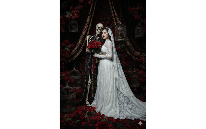 3.พรอมต์กลายร่างเป็นเจ้าสาวฮาโลวีน: “สร้างภาพไฮเปอร์เรียลลิสติก ให้ฉันเป็นเจ้าสาวสไตล์กอทิก สวมชุดแต่งงานลูกไม้สีขาว ยืนข้างโครงกระดูกที่กอดฉัน ในมือถือกุหลาบแดง ถุงมือลูกไม้และผ้าคลุมหน้ายาว พื้นหลังเต็มไปด้วยกุหลาบ กรงนก และผ้าม่านกอทิกหรู แสงเงาดรามาติก รายละเอียดพื้นผิวที่คมชัด”