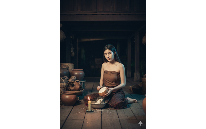 4.พรอมต์ข้ามภพไปหาหนังสยองขวัญไทย: “สร้างภาพไฮเปอร์เรียลลิสติก ให้ฉันใส่ผ้าแถบสีน้ำตาลโบราณกับผ้าซิ่น นั่งขูดมะพร้าวบนพื้นไม้ใต้ถุนบ้านไทย ผมยาวสีดำ ผิวซีดแบบวิญญาณ ฉากครัวโบราณ มีหม้อ ตะกร้า กะลามะพร้าว แสงเทียนริบหรี่ บรรยากาศแบบภาพยนตร์สยองขวัญไทย”