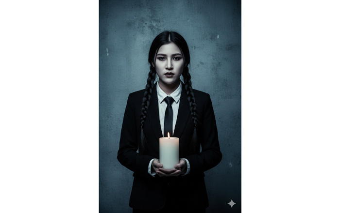 1.พรอมต์คลาสเรียนสายดาร์ก: “เปลี่ยนฉันให้เป็นภาพพอร์ตเทรตสไตล์กอทิกสมจริง โทนดาร์ก สวมเบลเซอร์ดำ เชิ้ตขาว เนกไทดำ ผมยาวสีดำถักเปียสองข้าง แสกกลาง แต่งหน้าโทนซีด ทาลิปสีเข้ม ถือเทียนขาวเล่มใหญ่มีเปลวไฟ สีหน้าขรึม ด้านหลังเป็นกำแพงสีเทาอมน้ำเงินมี Texture และมีเอฟเฟกต์แบบ Grunge”