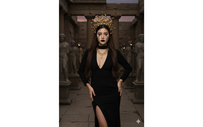 2.พรอมต์คาแรกเตอร์กรีกในตำนาน: “เปลี่ยนฉันให้สวมที่คาดผมทองประดับด้วยงู คล้ายสไตล์เมดูซา ผมยาวสลวย สีหน้าจริงจัง ดวงตาแฝงด้วยความลึกลับ มีรอยน้ำตาสีดำ ริมฝีปากดำสนิท สวมชุดเดรสดำ ใส่สร้อยคอสีทองที่ดูโดดเด่น พื้นหลังเป็นสถานที่แบบกรีก เต็มไปด้วยรูปปั้นที่ถูกสาปให้กลายเป็นหิน”