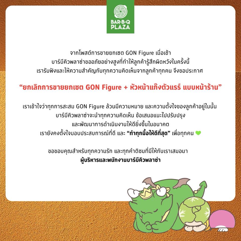 “จากโพสต์การขายยกเซต GON Figure เมื่อเช้า บาร์บีคิวพลาซ่าขออภัยอย่างสูงที่ทําให้ลูกค้ารู้สึกผิดหวังในครั้งนี้ เรารับฟังและให้ความสําคัญกับทุกความคิดเห็นจากลูกค้าทุกคน จึงขอประกาศ *ยกเลิกการขายยกเซต GON Figure + หัวหน้าแก๊งตัวแรร์ แบบหน้าร้าน” เราเข้าใจว่าทุกการสะสม GON Figure ล้วนมีความหมาย และความตั้งใจของลูกค้าอยู่ในนั้น บาร์บีคิวพลาซ่าจะนําทุกความคิดเห็น ข้อเสนอแนะไปปรับปรุง และพัฒนาการดําเนินงานให้ดียิ่งขึ้นในอนาคต เรายังคงตั้งใจมอบประสบการณ์ที่ดี และทําทุกมื้อให้ดีที่สุด เพื่อทุกคน ขอขอบคุณสําหรับทุกความรัก และทุกคําติชมที่มีให้กับเราเสมอมา ผู้บริหารและพนักงานบาร์บีคิวพลาซ่า”