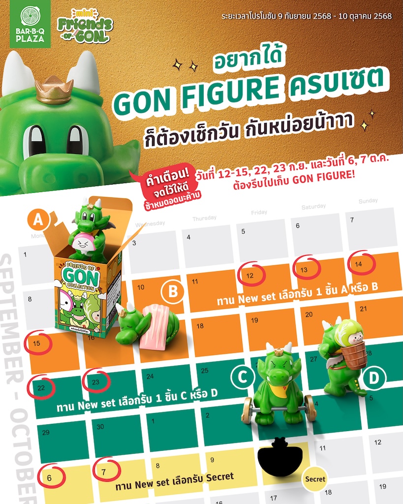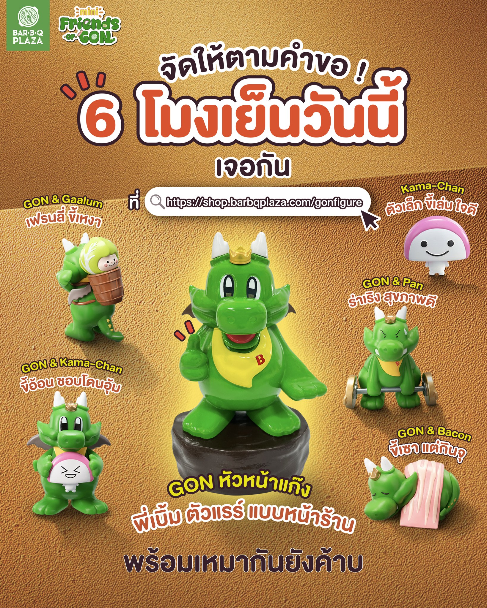 โดยในปีที่ผ่านมา บาร์บีคิวพลาซ่าได้ออก OH MY GON! Collection มาเป็นคอลเลกชั่นแรก วางจำหน่ายในเดือนเกิดของพี่ GON ตั้งแต่วันที่ 2-30 กันยายน 2567 ที่ผ่านมา โดยมีให้สะสมทั้งหมด 5 แบบ เงื่อนไขคือ รับ Figure 1 ตัว เมื่อสั่งอาหารชุด 1 ชุด ได้แก่ OH MY PORK! ราคา 799.- หรือ OH MY BEEF! ราคา 849.- ซึ่งจะออกแบบใหม่มาทุกสัปดาห์