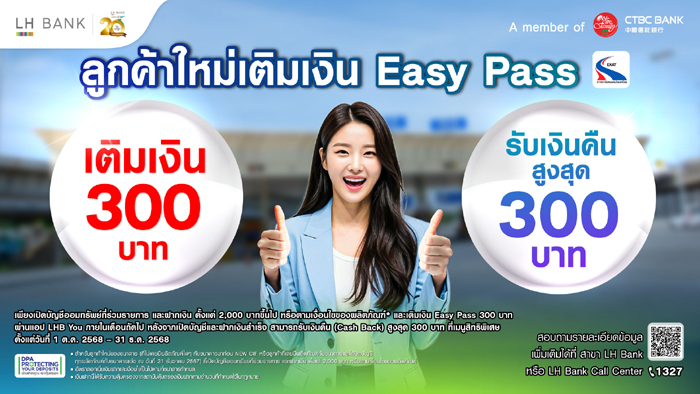 นายพีรพัฒน์ เกษบุญชู ประธานเจ้าหน้าที่บริหารกลุ่มลูกค้ารายย่อย เปิดเผยว่า เพื่อฉลองความร่วมมือระหว่าง LH Bank และการทางพิเศษแห่งประเทศไทย ธนาคารจึงออกแคมเปญพิเศษสำหรับลูกค้าใหม่เมื่อเปิดบัญชีออมทรัพย์ที่ร่วมรายการ และมียอดฝากเงินขั้นต่ำตั้งแต่ 2,000 บาทขึ้นไป หรือตามเงื่อนไขผลิตภัณฑ์ที่ธนาคารกำหนด และเลือกเติมเงินบัตร Easy Pass 300 บาท ผ่านแอปฯ ในเดือนถัดไปหลังจากเปิดบัญชีและฝากเงินสำเร็จ สามารถรับเงินคืน (Cash Back) สูงสุด 300 บาท ผ่านเมนู “สิทธิพิเศษ” (Rewards) บนแอปพลิเคชัน LHB You ตามเงื่อนไขที่ธนาคารกำหนด โปรโมชันตั้งแต่วันที่ 1 ตุลาคม 2568 – 31 ธันวาคม 2568