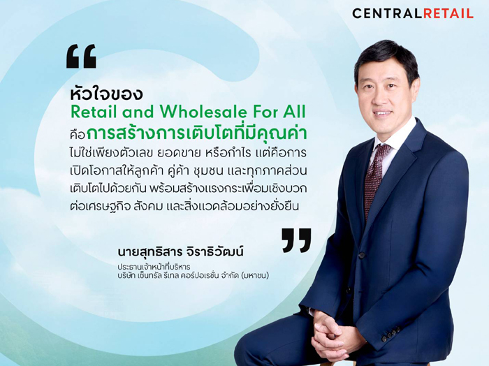 นายสุทธิสาร จิราธิวัฒน์ ประธานเจ้าหน้าที่บริหาร บริษัท เซ็นทรัล รีเทล คอร์ปอเรชั่น จำกัด (มหาชน) หรือ CRC กล่าวว่า “เซ็นทรัล รีเทล มุ่งมั่นในจุดยืนและเจตนารมณ์ที่ชัดเจนของการเป็น “Retail and Wholesale For All” ที่ไม่เพียงมุ่งเน้นการเติบโตของธุรกิจ แต่คือการสร้างการเติบโตที่มีคุณค่า และเปิดโอกาสให้ทุกภาคส่วนได้เติบโตไปด้วยกัน และด้วย Ecosystem ขนาดใหญ่ที่ครอบคลุมธุรกิจค้าปลีกและค้าส่งทั้งในไทยและต่างประเทศ ทำให้เราสามารถสร้างแรงกระเพื่อมเชิงบวกได้ในหลายมิติ ทั้งเศรษฐกิจ สังคม และสิ่งแวดล้อม ดังนั้น เซ็นทรัล รีเทล จึงได้ขับเคลื่อนเจตนารมณ์ของการเป็น Retail and Wholesale For All ผ่านปรัชญา “CRC Care” ที่เป็น Commitment สำคัญในการดูแลและยกระดับทุกภาคส่วนสู่ความยั่งยืน”